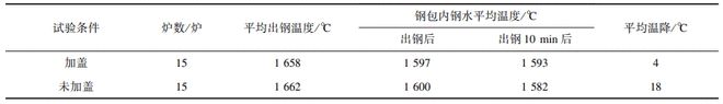 本次生產(chǎn)試驗(yàn)在一煉鋼廠55#80t鋼包上應(yīng)用了全程加蓋技術(shù)。在轉(zhuǎn)爐出鋼側(cè)平臺(tái)加新鋼結(jié)構(gòu)平臺(tái)安裝反向插齒加揭蓋裝置,連續(xù)試驗(yàn)15爐,出鋼溫度控制在1660±5℃,記錄轉(zhuǎn)爐出鋼10min后溫降情況,并與未加蓋數(shù)據(jù)進(jìn)行對(duì)比,試驗(yàn)結(jié)果如表4所示。