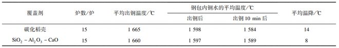 本次生產(chǎn)試驗(yàn)選用一煉鋼廠45#80t鋼包,分別記錄使用碳化稻殼覆蓋劑、SiO2-Al2O3-CaO覆蓋劑鋼包鋼水溫降情況,出鋼溫度控制在1660±5℃,覆蓋劑按照1kg/t的加入量,出鋼10min后測(cè)溫,各試驗(yàn)爐15爐。其中SiO2-Al2O3-CaO覆蓋劑成分如表2所示,溫度測(cè)量結(jié)果如表3所示。