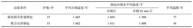 由表5看出,與碳化稻殼普通鋼包相比,應(yīng)用聯(lián)合保溫技術(shù)的鋼包內(nèi)的鋼水溫降平均少23℃,保溫效果良好。鋼包保溫效果的提升可適當(dāng)降低轉(zhuǎn)爐出鋼溫度,經(jīng)過一定時(shí)間的現(xiàn)場(chǎng)聯(lián)合應(yīng)用生產(chǎn)試驗(yàn)后發(fā)現(xiàn):出鋼溫度每降低1℃,鐵水與廢鋼間的混合比減少0.054%,金屬收得率增加0.02%;出鋼溫度降低,提高了轉(zhuǎn)爐的耐材壽命,鋼包耐材的保溫減少了急冷急熱導(dǎo)致的耐材剝落,平均使用壽命延長(zhǎng)10%以上;轉(zhuǎn)爐平均吹氧時(shí)間能夠減少1min,從而減少了煙氣排放,按2.5Nm3/℃噸鋼計(jì)算,年產(chǎn)400萬t的鋼廠降低出鋼溫度10℃可減少1×108Nm3廢氣排放。