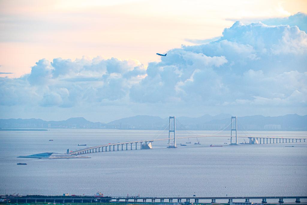 6月23日,從深圳寶安國際機(jī)場起飛的飛機(jī)飛過深中通道。新華社記者 毛思倩 攝