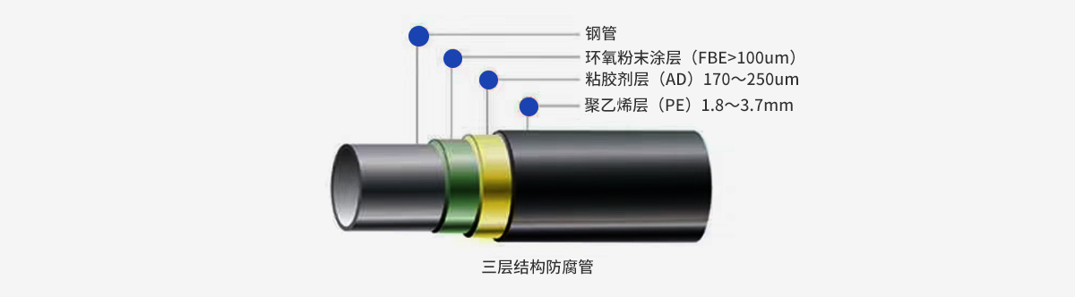 ●3PE防腐鋼管的涂層是底層與鋼管面所接觸的是環(huán)氧粉末防腐涂層,中間層為帶有分支結(jié)構(gòu)功能團(tuán)的共聚粘合劑。面層為高密度聚乙烯防腐涂層。