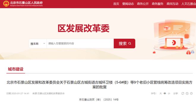 北京市石景山區(qū)發(fā)展和改革委員會關(guān)于石景山區(qū)古城街道古城環(huán)衛(wèi)樓(5-6#樓)等9個(gè)老舊小區(qū)管線統(tǒng)籌改造項(xiàng)目實(shí)施方案的批復(fù)
