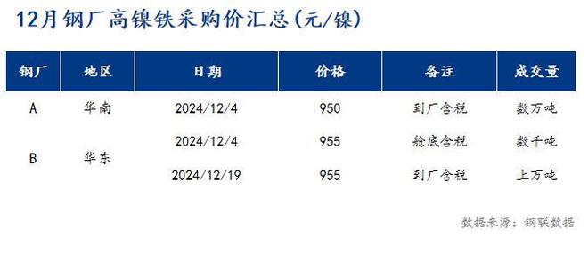 12月鎳鐵市場(chǎng)散單成交有限,多以長(zhǎng)協(xié)訂單為主,鎳鐵價(jià)格承壓運(yùn)行。月初,鎳鐵延續(xù)上月悲觀情緒,華南某主流鋼廠在950元/鎳(到廠含稅)招標(biāo)并成交數(shù)萬噸鎳鐵,其他鋼廠多數(shù)成交在955元/鎳(艙底含稅)附近,鎳鐵議價(jià)區(qū)間再度下移。隨后鎳鐵主流成交價(jià)格在950-960元/鎳(艙底含稅)上下波動(dòng),市場(chǎng)雖有低價(jià)傳言,但是沒有落實(shí)。成本端,印尼鎳礦供應(yīng)寬松,印尼鐵廠原料庫存?zhèn)鋷?-2月,疊加下游壓力傳導(dǎo)至礦端,鎳礦升水下跌至15美元/濕噸,鎳礦市場(chǎng)價(jià)格下跌至42.97美元/濕噸,鎳鐵成本支撐走弱。供應(yīng)端,鎳礦供應(yīng)寬松,印尼鎳鐵產(chǎn)量增產(chǎn)明顯,印尼鎳鐵回流量增加。需求端,臨近年底,鋼廠計(jì)劃減產(chǎn)檢修,對(duì)鎳鐵的需求轉(zhuǎn)弱,另外不銹鋼現(xiàn)貨價(jià)格持續(xù)走低,鋼廠向上尋求利潤(rùn)空間,加大對(duì)原料的壓價(jià)力度,心理價(jià)位下移至940元/鎳(到廠含稅)附近。在供需雙方的相互博弈下,市場(chǎng)陷入僵局,鎳鐵價(jià)格承壓運(yùn)行在950元/鎳(艙底含稅)附近。
