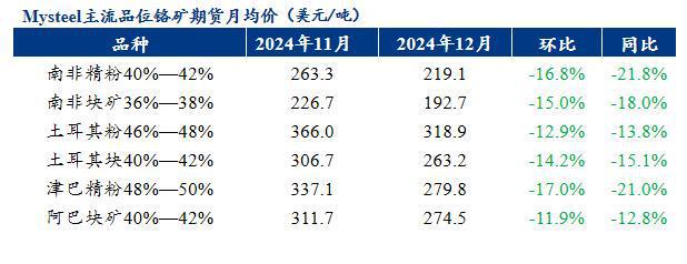 鉻礦期貨價(jià)格現(xiàn)狀:2024年12月鉻礦期貨價(jià)格回落。南非精粉40%—42%月均價(jià)格回落至219.1美元/噸。環(huán)比降16.8%。土耳其塊礦40%—42%月均價(jià)格下降至263.2美元/噸,環(huán)比降幅14.2%,阿巴塊礦40%—42%月均價(jià)格下降至274.5美元/噸,環(huán)比降幅11.9%。 價(jià)格變動(dòng)原因:12月高碳鉻鐵鋼招和市場(chǎng)零售價(jià)格繼續(xù)下降,鉻鐵廠生產(chǎn)利潤(rùn)繼續(xù)承壓,原料采購(gòu)意愿較低,期貨礦山讓利出貨。 未來預(yù)期:2025年1月鉻礦期貨價(jià)格預(yù)計(jì)弱穩(wěn)運(yùn)行。(1)合金端悲觀預(yù)期不減,預(yù)計(jì)還會(huì)有一輪價(jià)格下壓,但是當(dāng)前期貨鉻礦價(jià)格逐漸來到相對(duì)底部位置,礦山和貿(mào)易商均面臨虧損或虧損進(jìn)一步擴(kuò)大,因此鉻礦期貨價(jià)格預(yù)期弱。