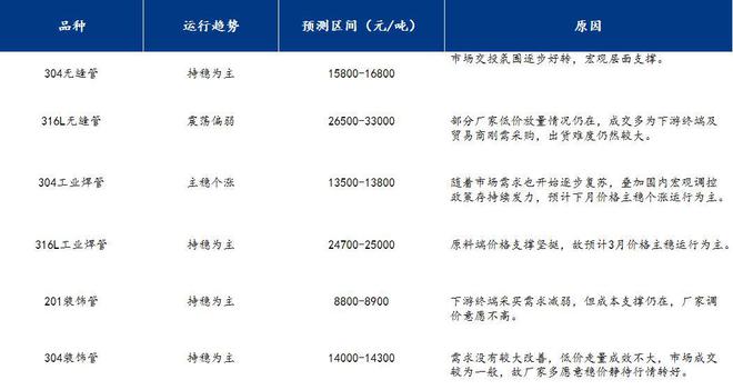 金年會(huì)官網(wǎng)注冊(cè)Mysteel月報(bào):不銹鋼管材價(jià)格主穩(wěn)運(yùn)行成交情況未及理想預(yù)期(21-228)月初,大多管廠已經(jīng)復(fù)工開業(yè),為維護(hù)市場(chǎng)行情,仍舊是持穩(wěn)價(jià)態(tài)度。成交多集中在300系,庫存材質(zhì)規(guī)格較完善,但釋放速度與預(yù)期相差較大,下游需求受限,市場(chǎng)整體詢單氛圍冷清,僅零星散單成交,交易信心大受影響。