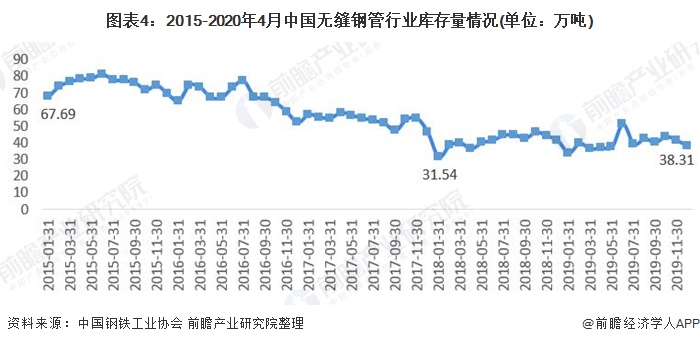 在“減產(chǎn)提質(zhì)”的主基調(diào)下,2014-2019年,我國無縫鋼管行業(yè)產(chǎn)量逐漸下滑,2019年無縫鋼管產(chǎn)量約為2384萬噸。也正因如此,我國無縫鋼管庫存量呈現(xiàn)波動(dòng)下降的趨勢,由2015年年初的67.69萬噸下滑至2019年年末的38.31萬噸,其中最低庫存量低至31.54萬噸。