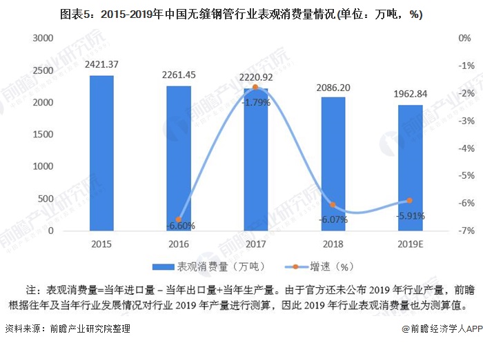 在消費(fèi)端,船舶制造行業(yè)三大造船指標(biāo)整體呈下降趨勢,汽車產(chǎn)業(yè)近年來產(chǎn)量有所下滑,對(duì)我國無縫鋼管消費(fèi)量產(chǎn)生一定的影響。不過,國際油價(jià)提振,國內(nèi)石油開采力度增強(qiáng);以及發(fā)電設(shè)備產(chǎn)量基本穩(wěn)定等,對(duì)國內(nèi)無縫鋼管消費(fèi)量形成一定的支撐。2015-2019年,我國無縫鋼管表觀消費(fèi)量下滑速度較產(chǎn)量較慢,2019年我國無縫鋼管表觀消費(fèi)量為1962.84萬噸。