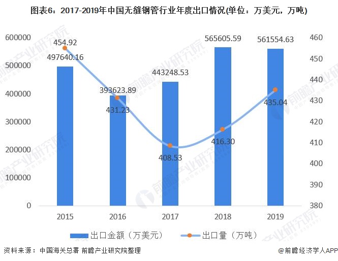 在進(jìn)出口方面,2015-2019年,我國出口無縫鋼管數(shù)量和出口金額均呈現(xiàn)先下降后上升的趨勢,但不同的是,2017年我國出口無縫鋼管數(shù)量持續(xù)下降的背景下,我國無縫鋼管出口金額呈上升趨勢,其主要原因是2017年我國無縫鋼管單價(jià)有所提高。2019年,我國無縫鋼管出口量和出口金額分別為435.04萬噸和561554.63萬美元。