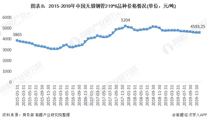 在價(jià)格方面,受益于庫存壓力下降、原材料價(jià)格上漲等,2015-2019年,我國無縫鋼管價(jià)格呈波動(dòng)上升趨勢。以無縫鋼管219*6品種價(jià)格為例,其價(jià)格從2015年年初的3865元/噸上漲至2019年年末的4593.25元/噸,漲幅超過18%。