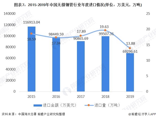 在進(jìn)口數(shù)量上,2015-2018年,我國進(jìn)口無縫鋼管數(shù)量在20萬噸左右;2019年呈現(xiàn)下滑趨勢,進(jìn)口數(shù)量為13.88萬噸。在進(jìn)口金額上,2015-2019年,我國進(jìn)口無縫鋼管金額呈現(xiàn)先下降后上升再下降的趨勢,2019年下滑至69296.61萬美元。2019年進(jìn)口數(shù)量和進(jìn)口金額均出現(xiàn)大幅下降的主要原因是我國對(duì)原產(chǎn)于美國和歐盟的進(jìn)口相關(guān)高溫承壓用合金鋼無縫鋼管所適用的反傾銷措施進(jìn)行期終復(fù)審調(diào)查。