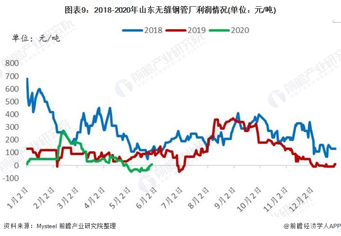 但是,由于無縫鋼管行業(yè)產(chǎn)能過剩、產(chǎn)品同質(zhì)化等問題依然存在,因此近年來行業(yè)利潤仍有小幅下滑的趨勢。jinnianhui金年會(huì)官網(wǎng)以我國生產(chǎn)主要無縫鋼管地區(qū)山東無縫鋼管廠為例,2018-2020年5月,山東無縫鋼管廠利潤整體呈下降趨勢。