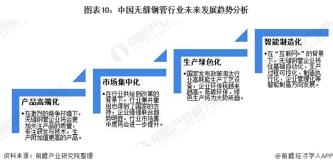 總的來看,我國無縫鋼管行業(yè)在轉(zhuǎn)型升級(jí)階段已經(jīng)取得了一定的成效,但離成為全球無縫鋼管生產(chǎn)強(qiáng)國仍有一定的距離,我國無縫鋼管企業(yè)仍需努力。在供給側(cè)的改革背景下,企業(yè)應(yīng)當(dāng)堅(jiān)持摒棄以量取勝的發(fā)展道路,而更應(yīng)關(guān)注產(chǎn)品的附加值,打造高質(zhì)量產(chǎn)品。前瞻認(rèn)為,在未來的發(fā)展趨勢上,我國無縫鋼管行業(yè)將往產(chǎn)品高端化、市場集中化、生產(chǎn)綠色化和智能制造化等方向發(fā)展。