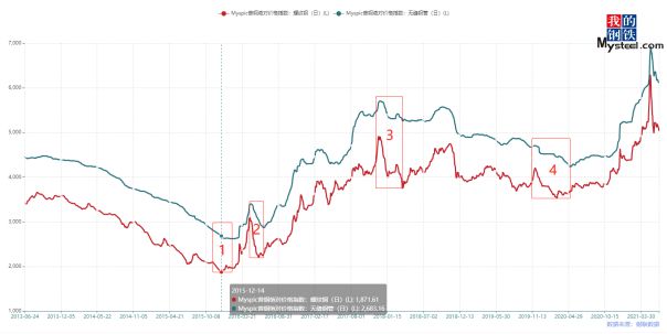 從2011年三月份開(kāi)始,鋼材市場(chǎng)經(jīng)歷了為期4年半的“熊市”階段,出現(xiàn)大量企業(yè)資不抵債、破產(chǎn)、金年會(huì)官方網(wǎng)站入口跑路等現(xiàn)象,直到2015年12月份,鋼材市場(chǎng)觸及熊市底部。圖一(1階段)螺紋鋼價(jià)格指數(shù)在2015年12月14日達(dá)到最低點(diǎn)1871點(diǎn),隨即由于供給側(cè)改革提出以及中國(guó)經(jīng)濟(jì)企穩(wěn)回升,螺紋率先開(kāi)始進(jìn)入為期3年的牛市階段,然而無(wú)縫鋼管價(jià)格指數(shù)并沒(méi)有止跌反彈,一路下跌至2016年2月3日,滯后螺紋鋼指數(shù)6周左右才達(dá)到最低點(diǎn)2622點(diǎn)。于此類(lèi)似,如圖一(4階段)在2020年熊市末期,螺紋鋼價(jià)格指數(shù)在2020年3月9日率先近三年最低點(diǎn)3537點(diǎn),而無(wú)縫管價(jià)格則滯后近8周時(shí)間跌至熊市底部4239點(diǎn)。此外,如圖一(2、3階段)為前期沖高回落下跌至階段性底部,2015年至今類(lèi)似于此階段性走勢(shì)不下十余次,每次無(wú)縫管價(jià)格指數(shù)總是滯后螺紋鋼價(jià)格指數(shù)約2-4周左右才達(dá)到階段性最低點(diǎn),隨即開(kāi)始反彈。然而無(wú)縫管價(jià)格上漲至階段性高點(diǎn)只滯后螺紋價(jià)格1-3個(gè)交易日。