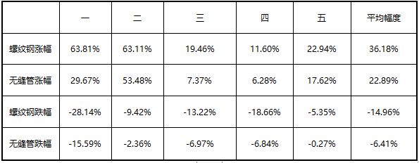 從2012年至今隨機(jī)選取兩個(gè)品種的五次階段性漲跌情況,并且進(jìn)行匯總??梢院?jiǎn)單的看出,螺紋鋼價(jià)格震蕩幅度是要強(qiáng)于無(wú)縫管震幅,幾乎每一個(gè)階段都是螺紋鋼上漲幅度要大于無(wú)縫管的上漲幅度,一般螺紋鋼漲幅平均要高于無(wú)縫管漲幅13%左右。相反,螺紋鋼價(jià)格在同一階段下跌幅度也大于無(wú)縫管下跌幅度,一般螺紋鋼跌幅平均要高于無(wú)縫管跌幅9%左右??偨Y(jié)來(lái)看,相對(duì)無(wú)縫管價(jià)格來(lái)看,螺紋價(jià)格可謂是“快漲快跌”的一個(gè)狀態(tài),無(wú)論是在價(jià)格的靈敏性還是價(jià)格的變化幅度,無(wú)縫管表現(xiàn)滯后于螺紋。