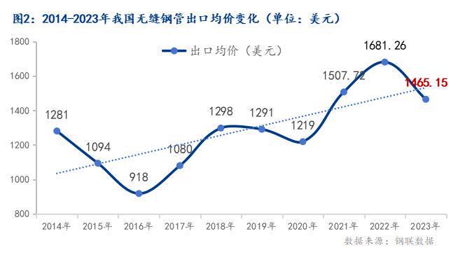 從2023年我國(guó)無(wú)縫管出口均價(jià)來(lái)看,2023年無(wú)縫管出口均價(jià)約為1465.15美元/噸(剔除不銹鋼管均價(jià)約為1300美元/噸,金年會(huì)官網(wǎng)登錄同比去年下降約122美元/噸),同比2022年均價(jià)1681.26美元/噸累計(jì)下降216.11美元/噸。雖2023年我國(guó)無(wú)縫管出口均價(jià)呈現(xiàn)大幅下降趨勢(shì),但由于國(guó)內(nèi)無(wú)縫管價(jià)格降幅更甚,因此這也更有利于無(wú)縫管出口。2023年無(wú)縫管出口量大幅增長(zhǎng)的重要因素之一便是無(wú)縫管出口價(jià)格優(yōu)勢(shì)明顯。