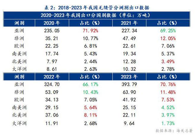 從洲別來(lái)看,歷年我國(guó)無(wú)縫管出口前三大洲以亞洲、非洲、歐洲國(guó)家為主,金年會(huì)官方網(wǎng)站入口出口至三大洲數(shù)量占比超過(guò)85%,其中2023年出口亞洲占比達(dá)到70.76%,相比2022年增加4.59%。2023年我國(guó)出口至各大洲無(wú)縫管呈現(xiàn)明顯分化,其中亞洲、非洲、歐洲出口占比均較2022年有一定增加,南美洲、北美洲、大洋洲出口占比均同比呈現(xiàn)下降。2023年尤其是進(jìn)入下半年,中東地區(qū)需求保持韌性,美洲由于貿(mào)易壁壘以及需求下降等問(wèn)題,導(dǎo)致我國(guó)無(wú)縫管出口美洲開(kāi)始放緩。