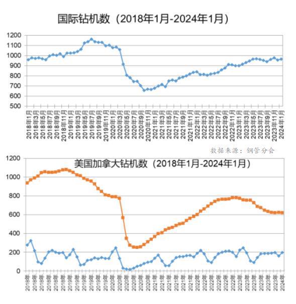 前文所提及,由于我國(guó)出口無(wú)縫管以油氣相關(guān)用管為主,因此油氣相關(guān)投資的情況也可以看作是我國(guó)無(wú)縫管出口的晴雨表。據(jù)海外數(shù)據(jù)顯示,國(guó)際鉆機(jī)數(shù)量從2020年年底開(kāi)始觸底反彈,已經(jīng)連續(xù)近4年處于持續(xù)增加態(tài)勢(shì),進(jìn)入2023年下半年,國(guó)際鉆機(jī)數(shù)量有明顯見(jiàn)頂跡象。從美國(guó)、加拿大2018-2024年的鉆機(jī)數(shù)量來(lái)看,進(jìn)入2023年下半年,鉆機(jī)數(shù)量就呈現(xiàn)出明顯的高位回落態(tài)勢(shì)。綜合來(lái)看,經(jīng)歷了多年的上升后,2023年下半年國(guó)際鉆機(jī)數(shù)量開(kāi)始呈現(xiàn)高位震蕩態(tài)勢(shì),鉆機(jī)數(shù)量一定程度上代表了海外油氣相關(guān)投資也映射了我國(guó)無(wú)縫管出口形勢(shì)。