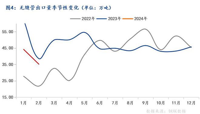 據(jù)海關(guān)總署數(shù)據(jù)顯示:2024年1-2月中國(guó)累計(jì)出口鋼材1591.2萬(wàn)噸,同比增長(zhǎng)32.6%;2024年1-2月中國(guó)累計(jì)出口無(wú)縫管79.32萬(wàn)噸,同比下降21.15%。雖2024年1-2月我國(guó)無(wú)縫管出口和鋼材出口呈現(xiàn)出了相反趨勢(shì),但是從對(duì)比數(shù)據(jù)可發(fā)現(xiàn),2024年1-2月無(wú)縫管出口同比下降有2023年高基數(shù)的因素在。從我國(guó)無(wú)縫管2024年1-2月出口總量來(lái)看,其繼續(xù)保持近40萬(wàn)噸/月,總量并不算低,但確實(shí)可以從一定程度上說(shuō)明我國(guó)無(wú)縫管出口量有見(jiàn)頂?shù)嫩E象。