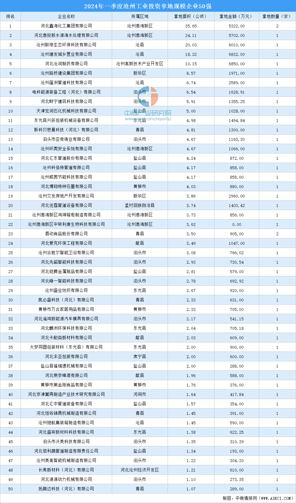 榜單顯示,一季度滄州投資拿地規(guī)模最大的10家企業(yè)分別為河北鑫?;ぜ瘓F(tuán)有限公司、河北渤投新水源海水處理有限公司、滄州聯(lián)綠生態(tài)環(huán)??萍加邢薰尽?a href="/" target="_blank">金年會(huì)官網(wǎng)登錄滄州建發(fā)城鄉(xiāng)置業(yè)有限公司、河北滄潤(rùn)制藥有限公司、滄州路橋建設(shè)集團(tuán)有限公司、滄州蘊(yùn)洲管道科技有限公司、電科能源裝備工程(河北)有限公司、河北畔寧建筑科技有限公司、天津宏潤(rùn)石化機(jī)械科技有限公司。TOP10企業(yè)拿地面積累計(jì)140.91公頃,比重為56.76%,入圍門檻為5.0公頃。