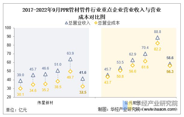 2022年1-9月,偉星新材總營業(yè)收入為41.6億元,同比增長3.4%;公元股份的總營收(58.6億元)較上年同期下降8.0%。此外,偉星新材(32.5億元)的2022年1-9月企業(yè)總營業(yè)成本低于公元股份(56.3億元),同比變化率分別為4.3%、-5.6%。