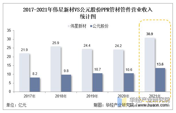 分企業(yè)來看,偉星新材的2021年PPR管材管件行業(yè)營收30.9億元,同比增長27.6%;公元股份則是營收13.6億元,較上年增長28.5%。